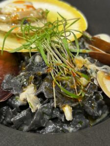 イカスミを練り込んだ同じ生地で幅広のパッパルデッレ、