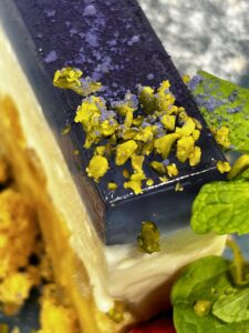 写真はマスカルポーネチーズ、ヘーゼルナッツ、バタフライピーを使ったドルチェです。